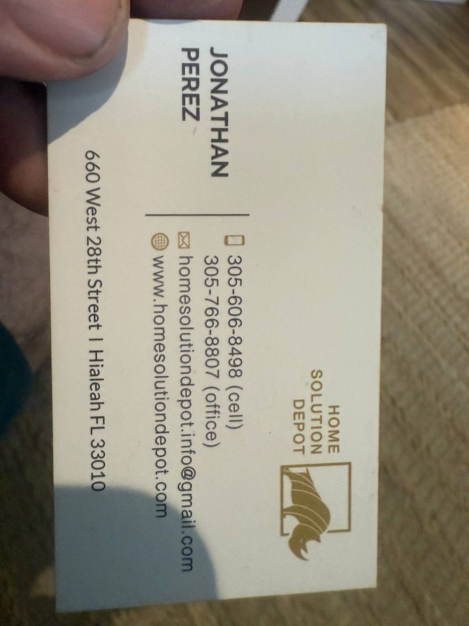 "text": "JONATHAN\nPEREZ\n\nHOME\nSOLUTION\nDEPOT\n\n305-606-8498 (cell)\n305-766-8807 (office)\nhomesolutiondepot.info@gmail.com\nwww.homesolutiondepot.com\n\n660 West 28th Street | Hialeah FL 33010"