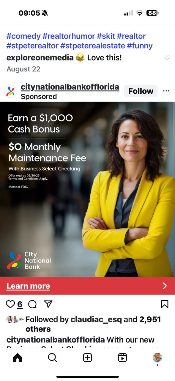 "09:05\n#comedy #realtorhumor #skit #realtor\n#stpeterealtor #stpeterealestate #funny\nexploreonemedia ๐ Love this!\nAugust 22\ncitynationalbankofflorida\nSponsored\nEarn a $1,000\nCash Bonus\n$0 Monthly\nMaintenance Fee\nWith Business Select Checking\nOffer expires 09/30/25\nTerms and Conditions Apply.\nMember FDIC\nCity\nNational\nBank\nLearn more\n6\nFollowed by claudiac_esq and 2,951\nothers\ncitynationalbankofflorida With our new"
