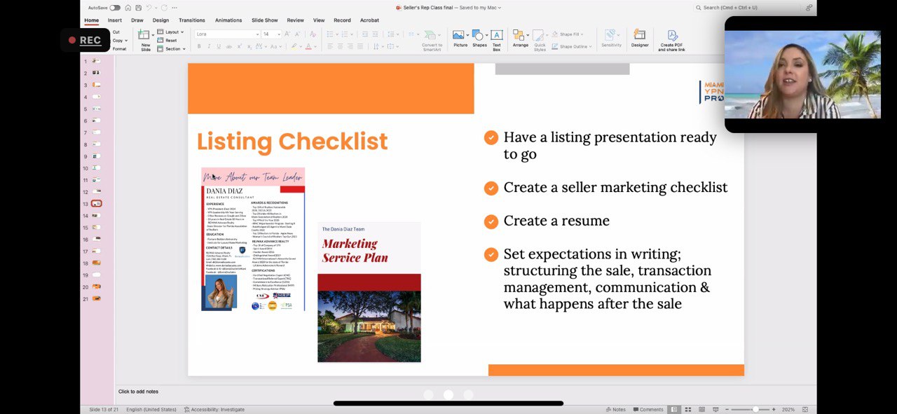 "text": "AutoSave\nSeller's Rep Class final - Saved to my Mac\nQ Search (Cmd + Ctrl + U)\nHome\nInsert\nDraw\nDesign\nTransitions\nAnimations\nSlide Show\nReview\nView\nRecord\nAcrobat\nREC\nCut\nCopy\nFormat\nNew\nSlide\nReset\nSection\nLora\n14\nConvert to SmartArt\nPictures\nShapes\nText\nBox\nArrange\nQuick\nStyles\nShape Fill\nShape Outline\nSensitivity\nDesigner\nCreate PDF\nand share link\nMIAMI\nYPN\nPRO\nListing Checklist\nMore About our Team Leader\nDANIA DIAZ\nREAL ESTATE CONSULTANT\nEXPERIENCE\nYPN President-Elect 2024\nYPN Presidential Advisory Group\nOffice Manager at Google and Zillow\nDirector on Real Estate MI Assoc.\nYPN State Chair Candidate\nState Director for Florida Association of Realtors\nEDUCATION\nFortune Builders University\nGold Lass for Launch/Chase Marketing\nCONTACT DETAILS\nDaniaDiaz@remax.net\n7210 Red Road, Miami, FL\n(305) 661-8228 (office)\nEmail: d@danidiazrealty.com\nWeb: https://www.danidiazrealty.com\nInstagram: @DaniaDiazRealtyGroup\nFacebook: @DDRGRealtor\nAWARDS & RECOGNITIONS\nTop 1% Nationwide 2020-2023\nNAHREP Top 250 in 2022\nTop 100 at Company of YPN\nYPN On the Rise Award 2017\nDistinguished Award 2018\nTop 30 Under 30 in Miami 2019\n20 Under 40 in the state of Florida\nLP State Association Award 2020\nRE/MAX ADVANCE REALTY\nTop 10 at Company of 300+ agents\nYPN On the Rise Award 2017\nDistinguished Award 2018\nCERTIFICATIONS\nGRI (Graduate Realtor Institute)\nTransnational Referral Expert (TRC)\nC2EX Commitment to Excellence\nMilitary Relocation Professional (MRP)\nPricing Strategy Advisor (PSA)\nC2EX MRP GRI PSA\nThe Dania Diaz Team\nMarketing\nService Plan\nHave a listing presentation ready\nto go\nCreate a seller marketing checklist\nCreate a resume\nSet expectations in writing;\nstructuring the sale, transaction\nmanagement, communication &\nwhat happens after the sale\nClick to add notes\nSlide 13 of 21\nEnglish (United States)\nAccessibility: Investigate\nNotes\nComments\n202%"