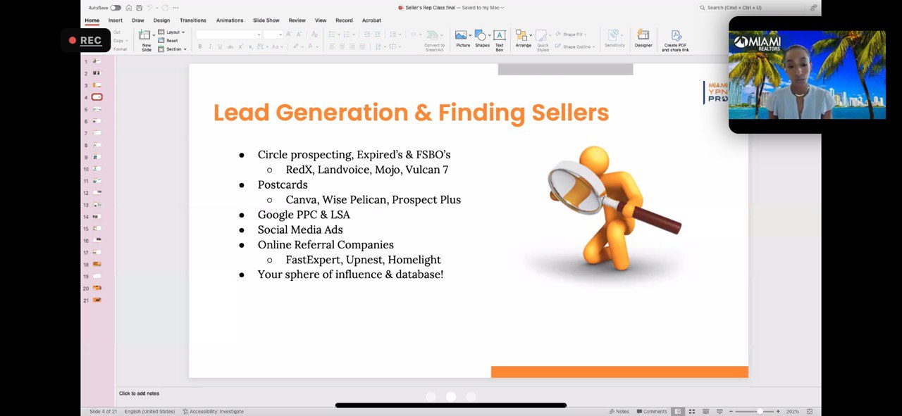 "text": "AutoSave\nSeller's Rep Class final - Saved to my Mac\nQ Search (Cmd + Ctrl + U)\nHome Insert Draw Design Transitions Animations Slide Show Review View Record Acrobat\nREC\nCut\nCopy\nFormat\nNew\nSlide\nReset\nSection\nPicture Shapes Text Box\nArrange\nShape Fill\nShape Outline\nDesigner\nCreate PDF and share link\nMIAMI REALTORS\nMIAMI YPN PRO\nLead Generation & Finding Sellers\nCircle prospecting, Expired's & FSBO's\no RedX, Landvoice, Mojo, Vulcan 7\nPostcards\no Canva, Wise Pelican, Prospect Plus\nGoogle PPC & LSA\nSocial Media Ads\nOnline Referral Companies\no FastExpert, Upnest, Homelight\nYour sphere of influence & database!\nClick to add notes\nSlide 4 of 21\nEnglish (United States)\nAccessibility: Investigate\nNotes\nComments\n202%"